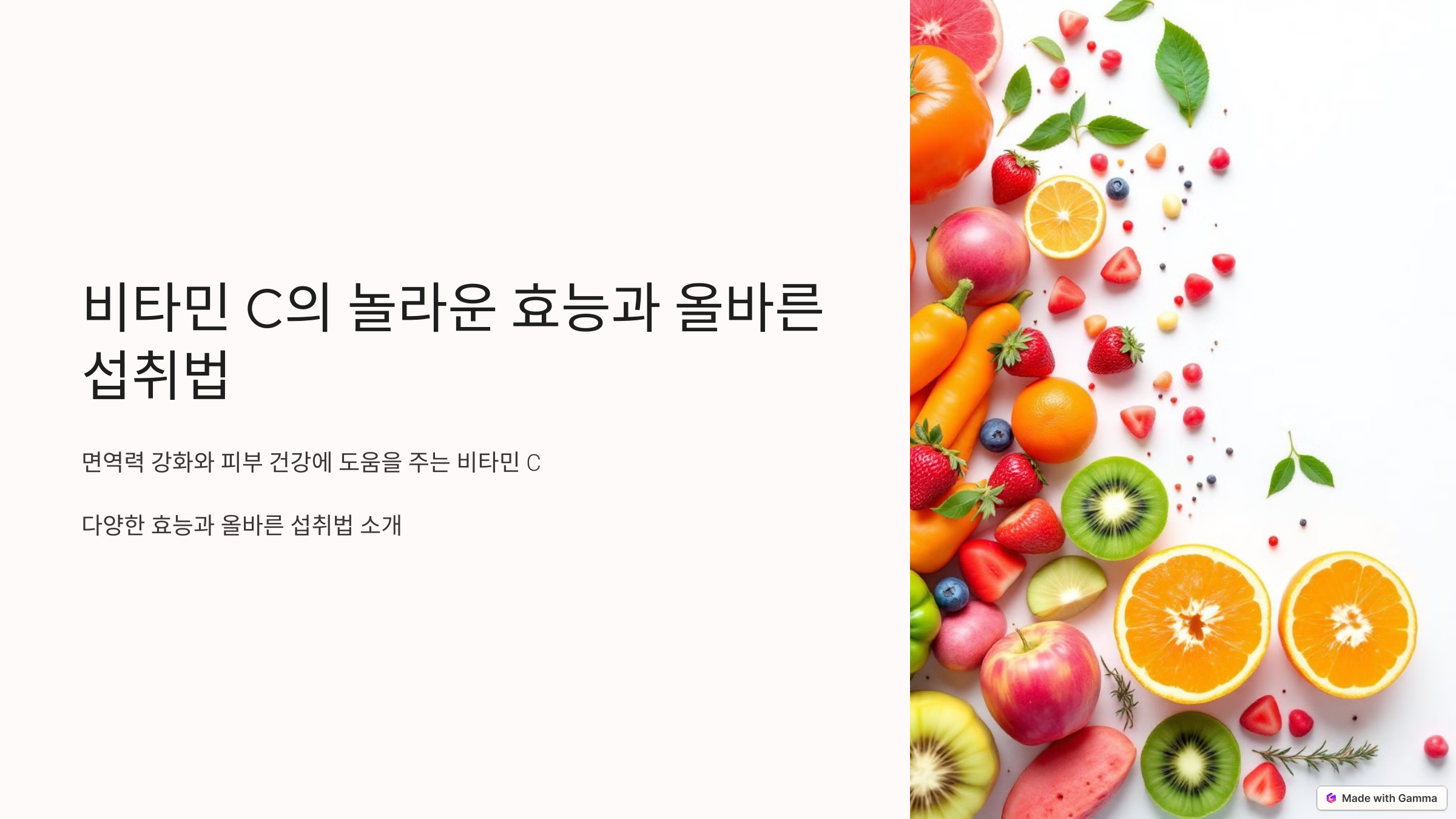 비타민 C는 강력한 항산화제로, 우리 몸에서 다양한 생리적 기능을 수행하는 필수 영양소예요. 특히 면역력 강화, 피부 건강, 철분 흡수 등에 중요한 역할을 하죠!